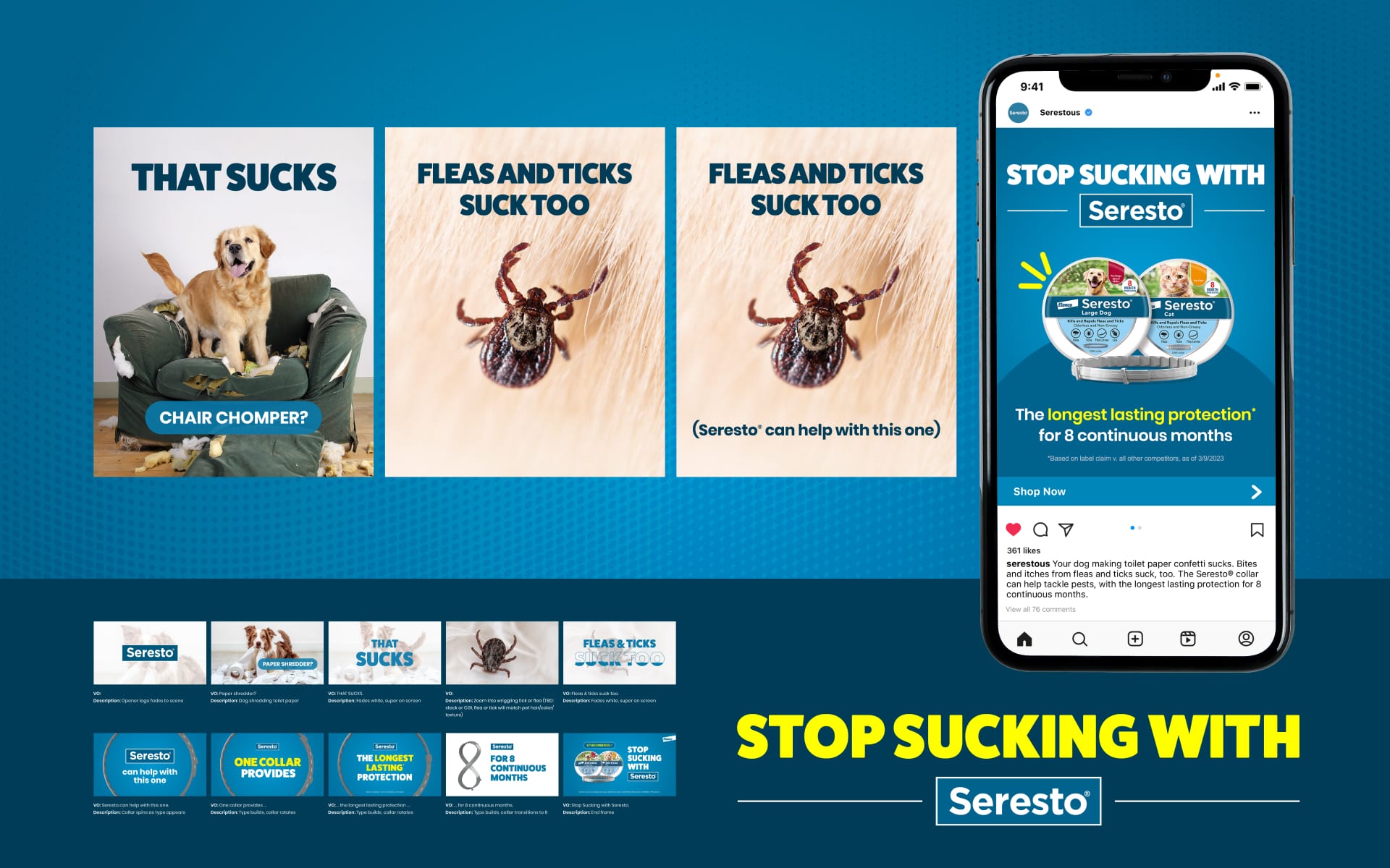 For Seresto, we needed to break through a category full of predictable, feel-good pet content where everything looked the same. We leaned into a simple, honest truth — fleas and ticks suck, and sometimes pet ownership does too. The Stop Sucking campaign brought a more direct, unexpected tone across digital, social, and owned channels — doubling CTR, tripling impressions, and driving a 20% lift in engagement.